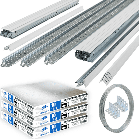Explore our Complete White Suspended Ceiling Grid System (600mm x 600mm) with sleek, easy-clean, and wipeable White ceiling tiles (595mm x 595mm) for a modern, professional finish.